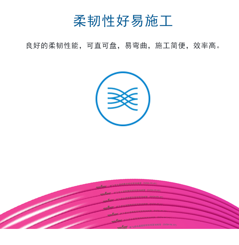 3、柔韧性强:便于施工,EVOH地暖管耐低温,在零下七十度也可以柔顺施工;